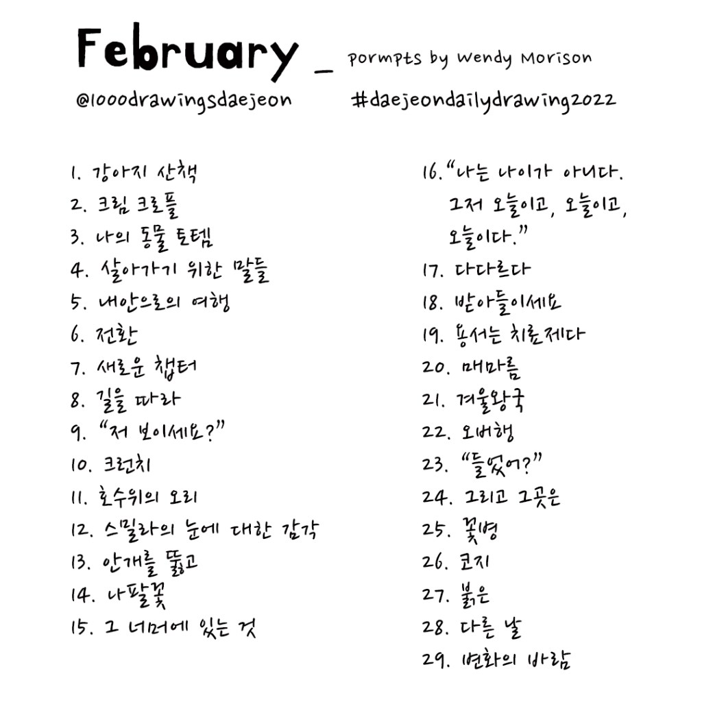 We continue our daily drawing challenge for 2022. We have asked Wendy Morison, artist and all-around inspiring person, to conjure up 29 drawing prompts for February.