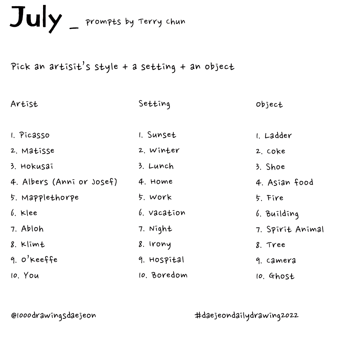 This month you get three sets of 10 words; an artist (style), a setting, and an object. You get to make a drawing of an object from the list, in a setting from the list, in the style of an artist from the list, or as you imagine they would’ve approached it. Mix and match as you like. Or just focus on one prompt at a time. You make the rules.