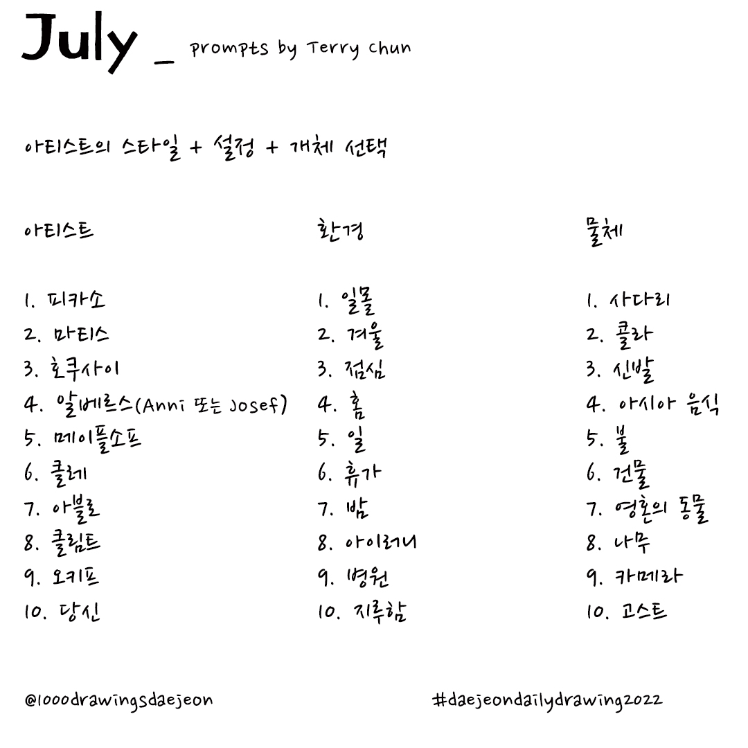 It’s July and we’re officially halfway through the year. Most of us, in the northern hemisphere at least, find ourselves on vacation with a little bit of extra time to play and experiment. The prompts for July have been thought up by Terry Chun and much like their creator, they’re a little unconventional.
