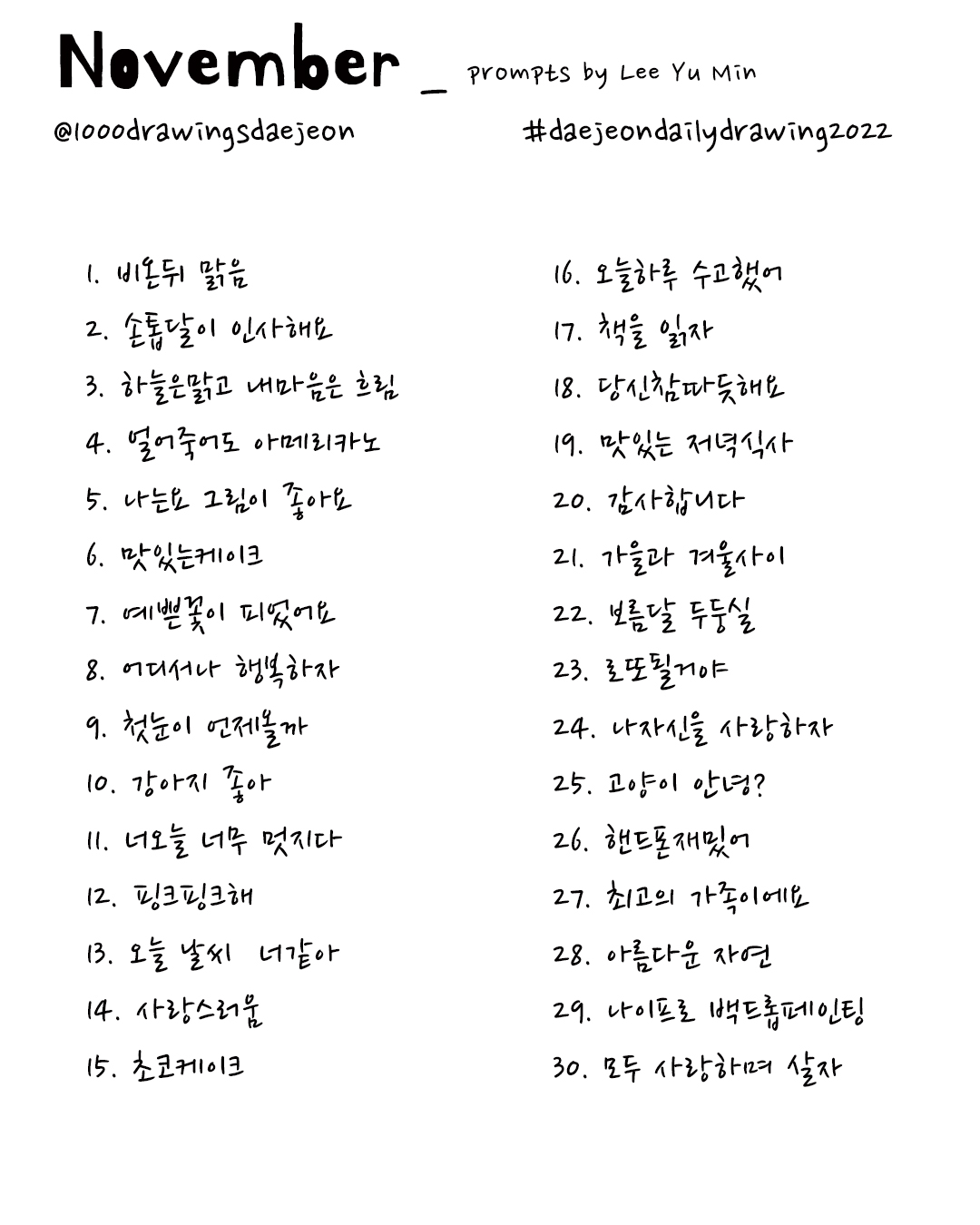 The year is coming to an end. Leaves are changing color and falling to the ground. November is here and we asked artist Lee Yu Min to make us a list of prompts for the month. Her prompts are sure to warm your heart and soul. We hope they inspire you to doodle in a cozy, warm place with a nice cup of tea or coffee.